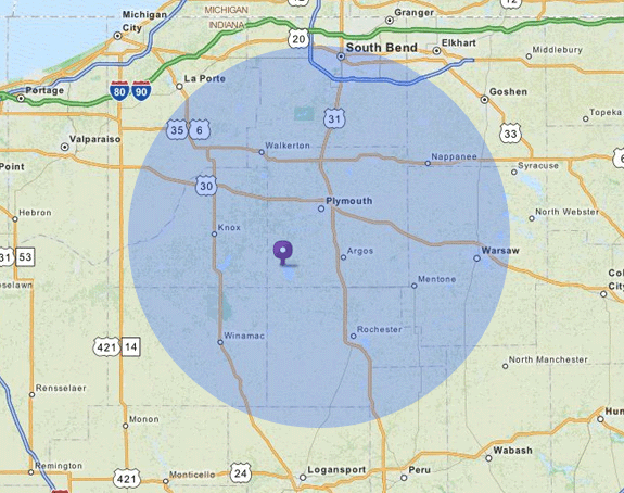 Our service area is approximately within a 30 mile radius of Culver, Indiana...see map below for reference.